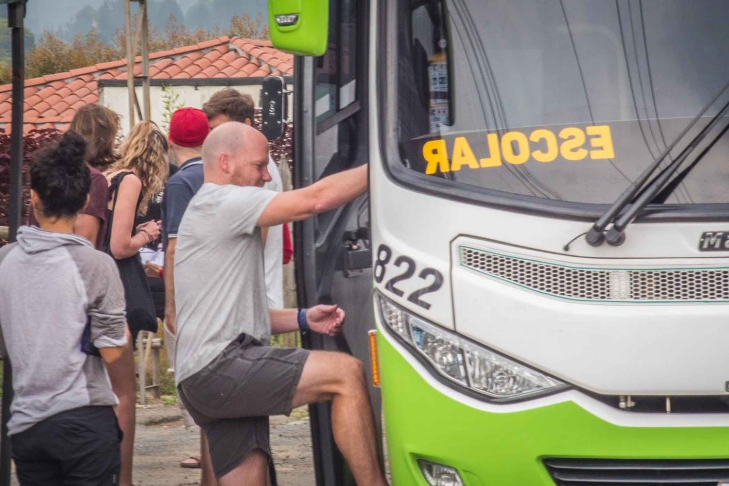 • Børn, der rejser gratis, sidder på skødet af deres forældre i bussen og deler deres forældres frokost. Frokost inkluderer vegetariske og veganske muligheder Der vil være et stop på 15 minutter på Medellín-Guatapé-motorvejen ved en butik, hvor du kan købe noget let at spise, hvis du ønsker det, og gå på toilettet.