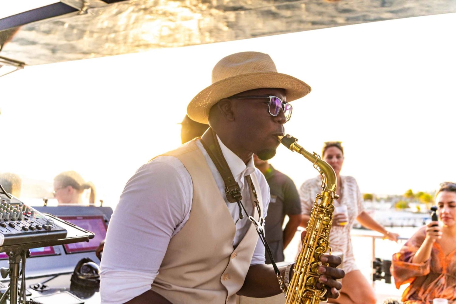 Imagine this… The most stunning sunset you've ever seen, along with live music, savoury bites, and refreshing drinks, all aboard our luxurious catamaran, the Gold Seahorse! Our spacious yacht offers two areas to explore: a relaxed lounge for those who want to take in the sunset in style and a vibrant deck where the party vibes take over later in the night. Once the sun dips below the horizon, our Sunset Cruise transforms into an unforgettable evening with elegant live music. As night falls, the DJ returns to turn up the energy, inviting everyone to hit the dance floor and show off their moves under the stars. Sailing around the stunning Spanish Water, you'll be swept away by the incredible views, music, and vibrant atmosphere. Whether you're looking to relax or dance the night away, the Gold Seahorse has it all!Includes
