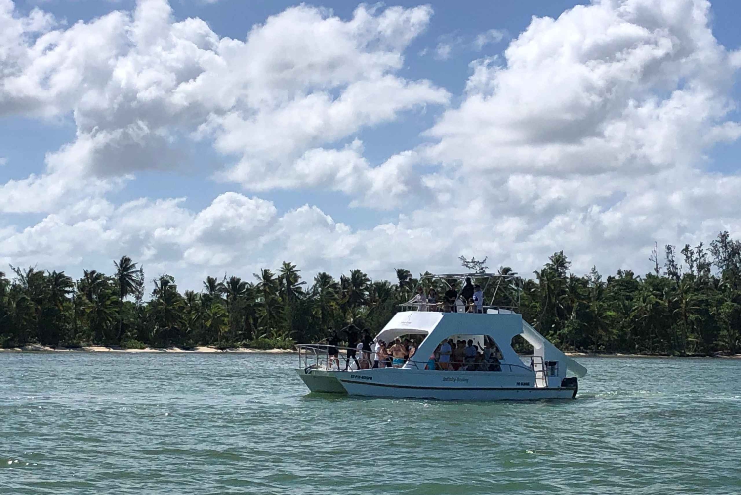 Discover the beauty of the Bavaro coast on an excellent catamaran excursion. The first activity you can enjoy is snorkeling, where you can see a wide variety of tropical fish. When you return to the ship you will find the bar open to everyone and you will be able to appreciate the flavor of our drinks (Barceló Rum, Presidente Beer, a variety of natural juices, Coca Cola, Sprite, water and the typical mamajuana), accompanied by a snack (nachos Mexican sauce and sweet cookies) all properly sealed. We will continue our tour towards the paradisiacal natural pool where you can relax, listen to good music, participating in our entertainment activities that will continue until we return to our meeting point.Includes