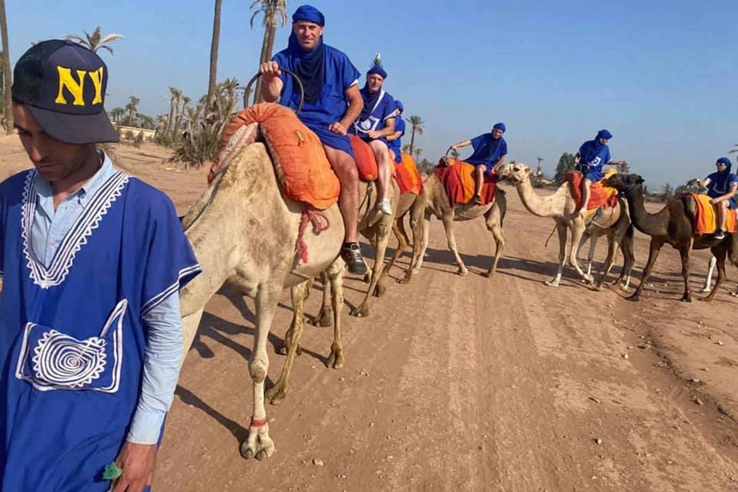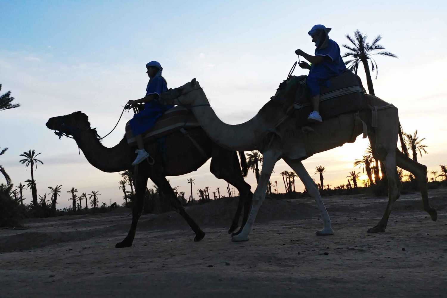 A eu le plaisir de se mettre dans la peau d'un Touareg le temps d'une balade. Équipés d'une CHACHE et d'une GANDORA (tenue officielle des hommes bleus), à dos de chameau nous vous ferons découvrir l'oasis de la Palmeraie de Marrakech. Le temps de vous mettre dans la peau d'un Touareg (les hommes bleus) en chevauchant la monture ancestrale des habitants du désert, balade détente aux abords de la ville ocre de Marrakech à travers l'oasis de la palmeraie. également ouvert aux familles avec enfants. Profitez d'une prise en charge à votre hôtel de Marrakech et admirez les magnifiques jardins, les orangers odorants et les palmeraies. Montez à dos de chameau avec l'aide des animateurs. Profitez d'une promenade pittoresque à dos de chameau dans la Palmeraie. Suivez votre guide qui vous emmènera dans les villages voisins pour découvrir la vie locale.Includes