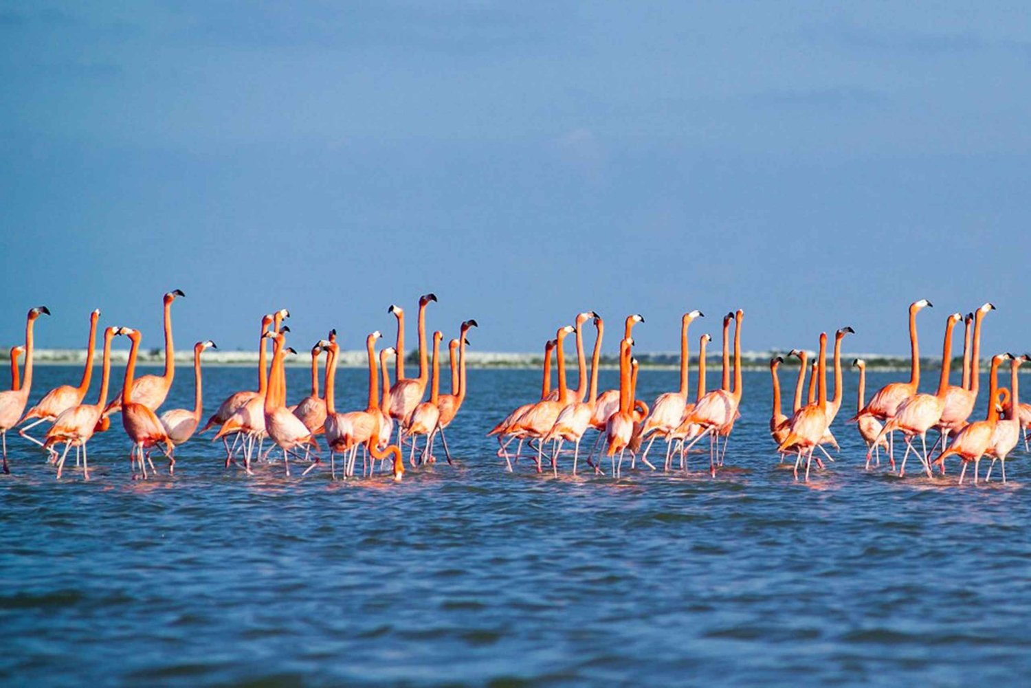 Rio Lagartos è un piccolo villaggio di pescatori all'interno di una Riserva Naturale; uno dei tesori naturali della Penisola dello Yucatan. Qui si può fare un tour in barca attraverso i suoi canali d'acqua circondati da mangrovie, dove si possono osservare diverse specie di uccelli come fenicotteri rosa, aironi, aquile, gabbiani, pellicani e cormorani. Durante il tour, potremo ammirare Las Coloradas. Potremo ammirare i depositi di sale, dove vedremo diversi corpi d'acqua coinvolti in questo processo, alcuni dei quali di un accattivante colore rosa. In seguito, ci rallegreremo del Bagno Maya, che ricopre il corpo di argilla ricca di sostanze nutritive. Successivamente, ci dirigeremo verso una spiaggia incontaminata per rimuovere l'argilla nell'acqua cristallina, dove ci divertiremo con il gustoso cibo locale a base di pesce e molluschi.Includes
