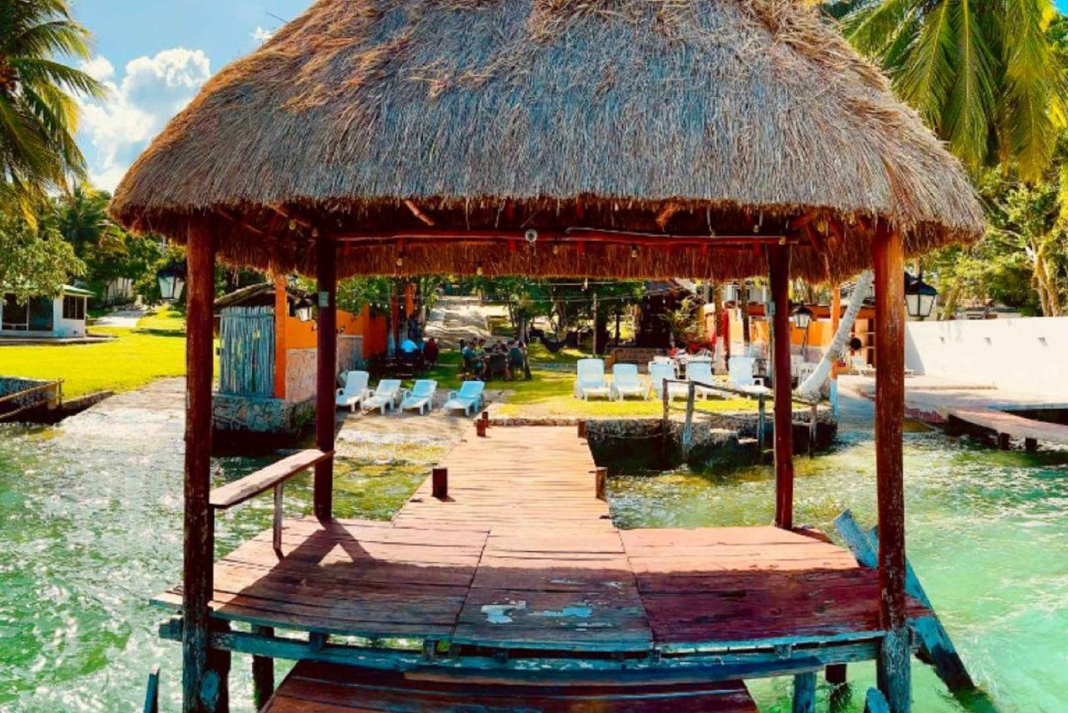 Trasporto di andata e ritorno Biglietti d'ingresso alla zona archeologica Guida (spagnolo e inglese) Acqua (illimitata), soda, birra o uno shot di tequila. Due ore nella laguna dei sette colori (Bacalar). Un pasto a persona e due bevande (alcoliche o analcoliche) nella laguna.Important Information