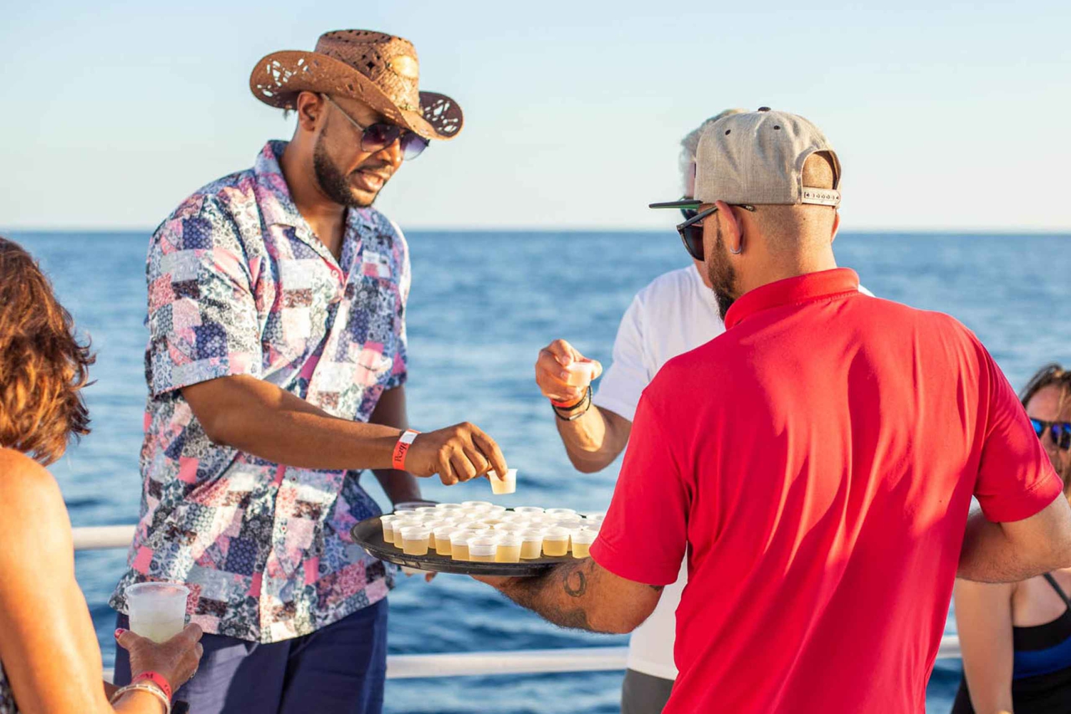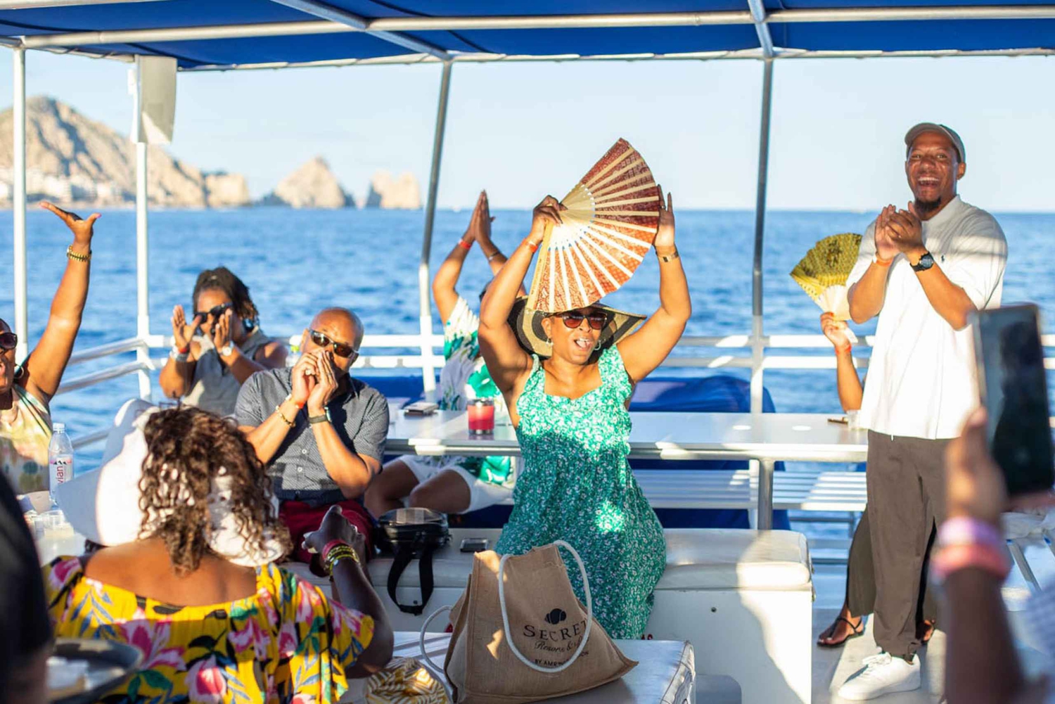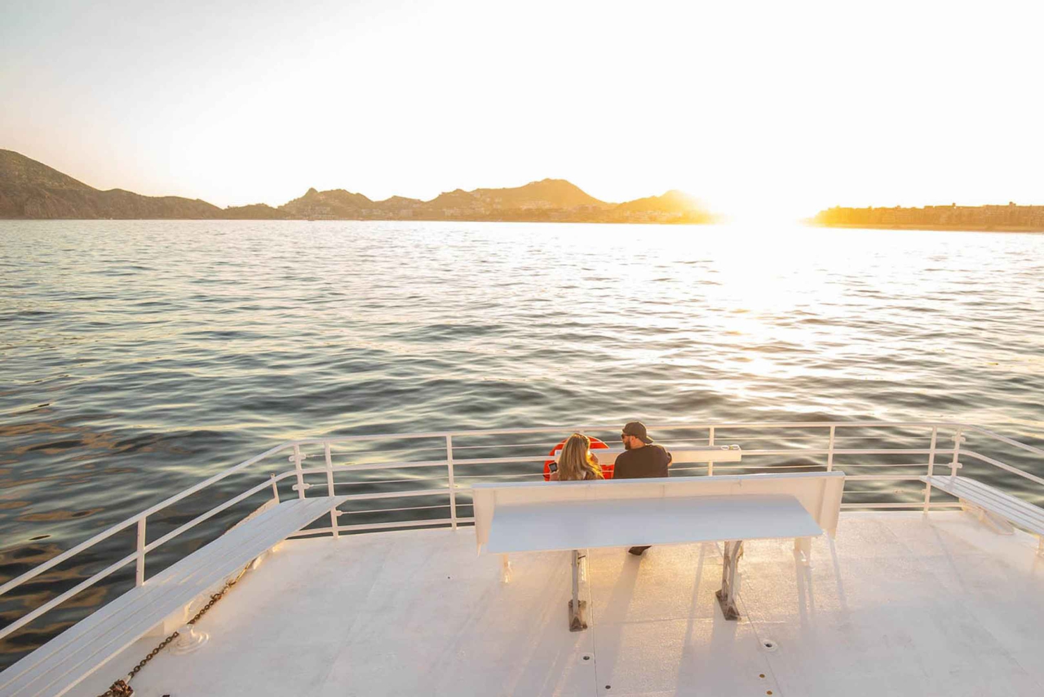 カボの最新スーパーパワーカタマラン、カボ マール号に乗って、今日のヒット曲やラテン風のリズムに合わせて踊りましょう。有名なアーチ、ラバーズ ビーチ、アシカのコロニーを巡りながら、無制限のプレミアム バーをお楽しみください。 ツアーは、カボ サン ルーカスのホテルでのお迎えから始まります。ドックに移動したら、クルーズに出発します。海に沈む夕日を眺めながら、カボの有名なランドマークを鑑賞しましょう。 その後、ボートは湾に戻り、錨を下ろします。乗組員が、アル パストール (マリネした豚肉)、チキン ティンガ、ビーフステーキ、ラハスとエロテ (ローストしたポブラノ ペッパーとトウモロコシの粒) など、食欲をそそるメキシコの味覚をさまざまなタコスとともに提供します。タコスには各種サルサが添えられ、デザートは伝統的なメキシコのキャンディーです。Includes