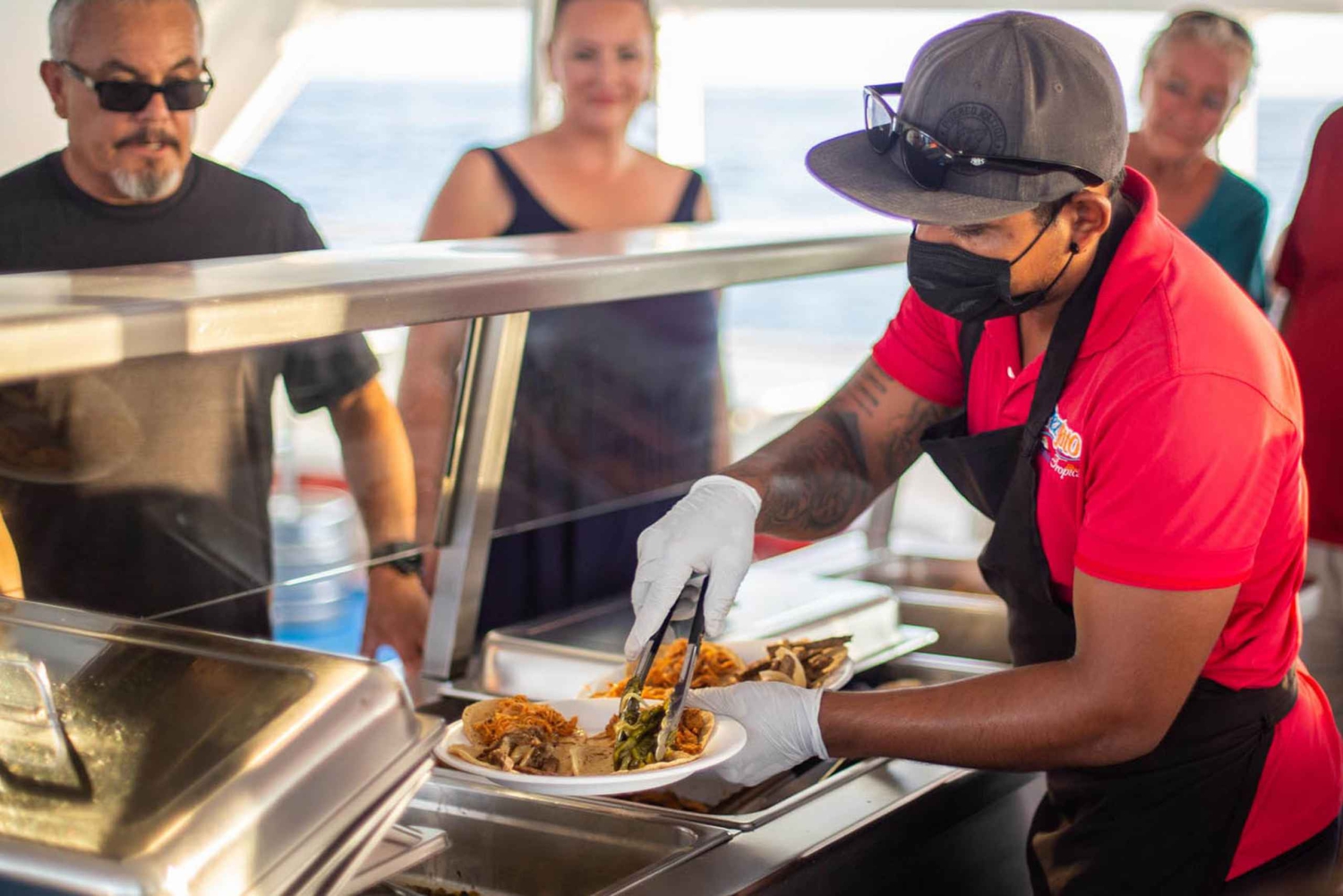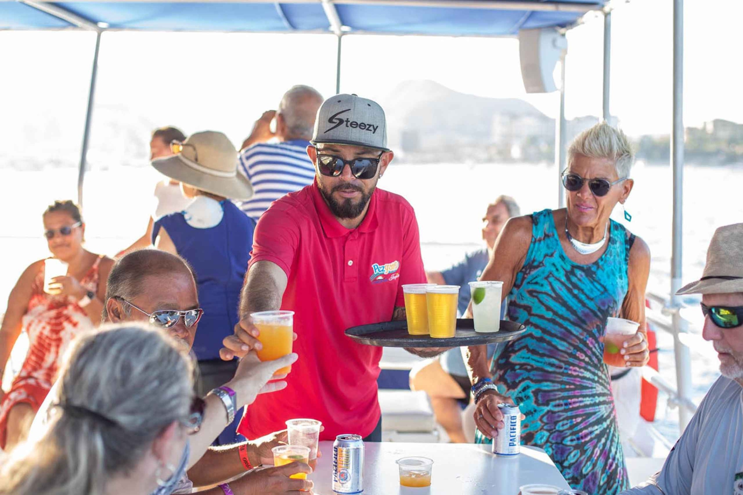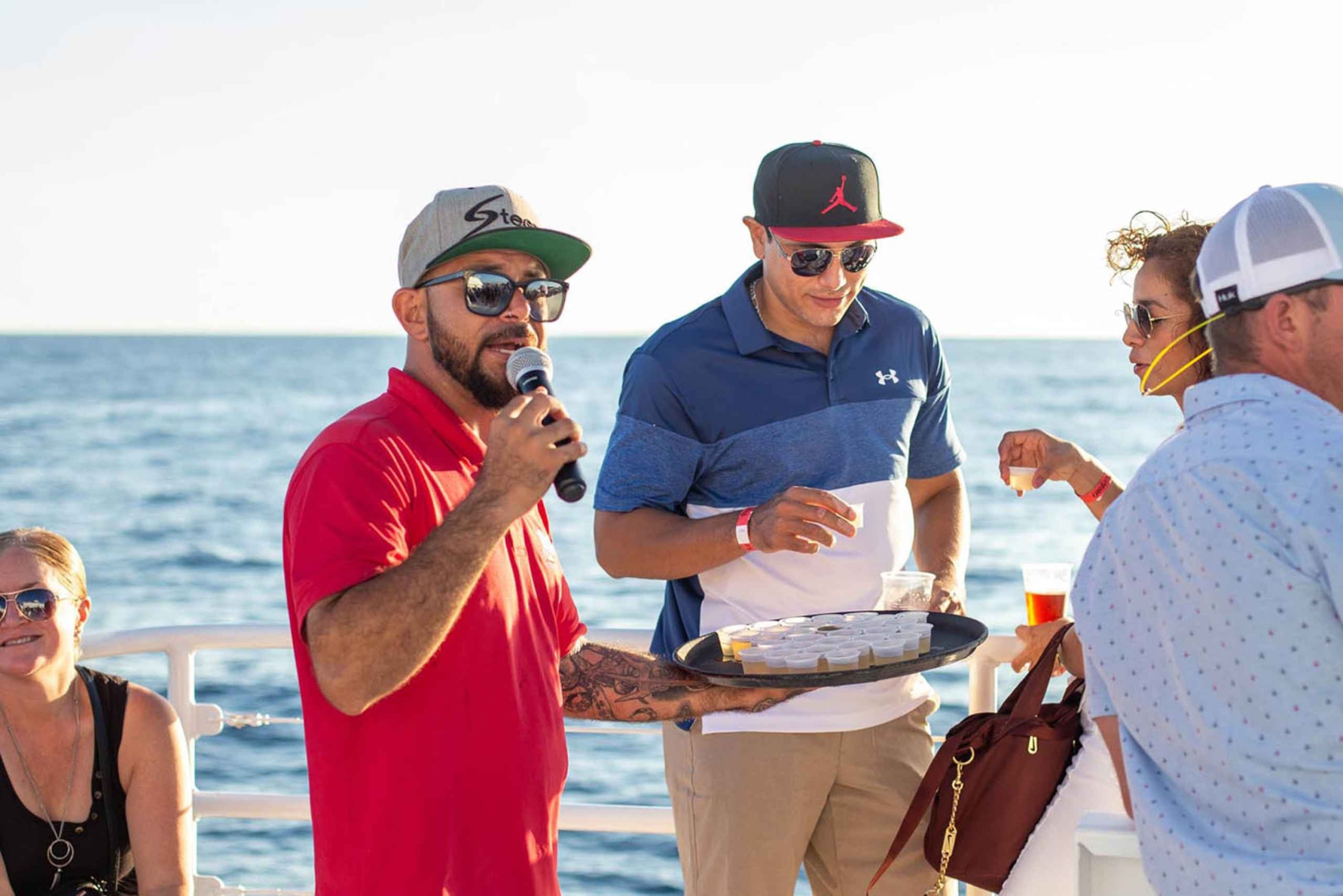 カボの最新スーパーパワーカタマラン、カボ マール号に乗って、今日のヒット曲やラテン風のリズムに合わせて踊りましょう。有名なアーチ、ラバーズ ビーチ、アシカのコロニーを巡りながら、無制限のプレミアム バーをお楽しみください。 ツアーは、カボ サン ルーカスのホテルでのお迎えから始まります。ドックに移動したら、クルーズに出発します。海に沈む夕日を眺めながら、カボの有名なランドマークを鑑賞しましょう。 その後、ボートは湾に戻り、錨を下ろします。乗組員が、アル パストール (マリネした豚肉)、チキン ティンガ、ビーフステーキ、ラハスとエロテ (ローストしたポブラノ ペッパーとトウモロコシの粒) など、食欲をそそるメキシコの味覚をさまざまなタコスとともに提供します。タコスには各種サルサが添えられ、デザートは伝統的なメキシコのキャンディーです。Includes