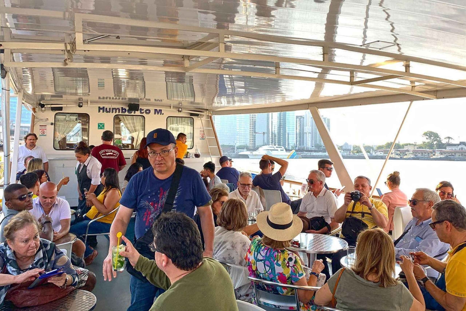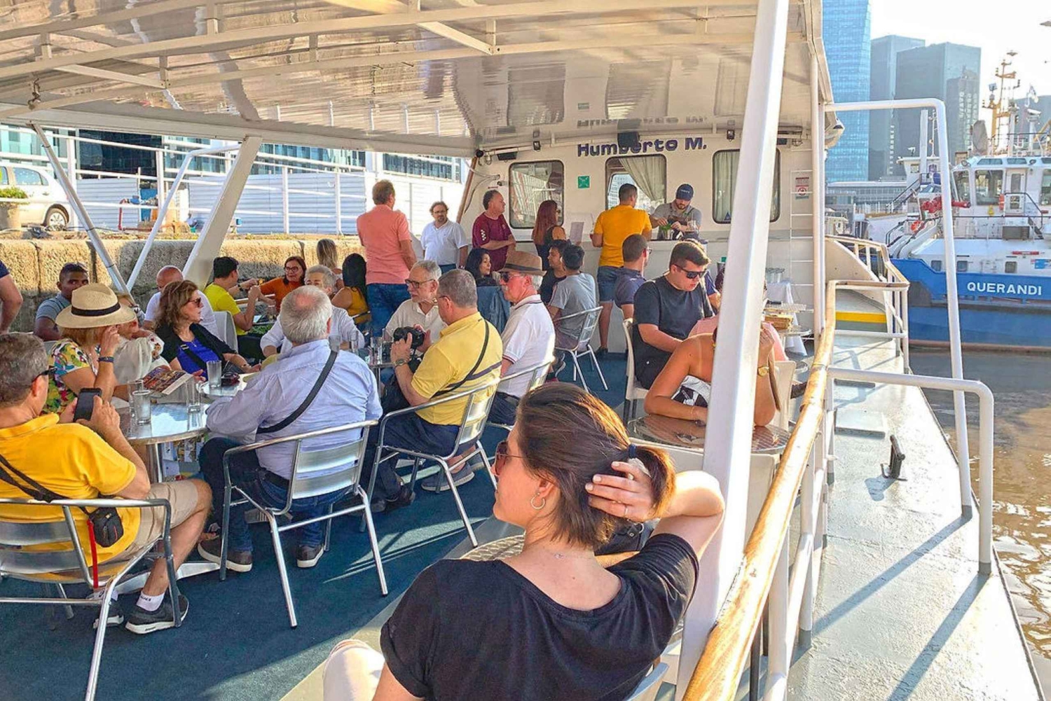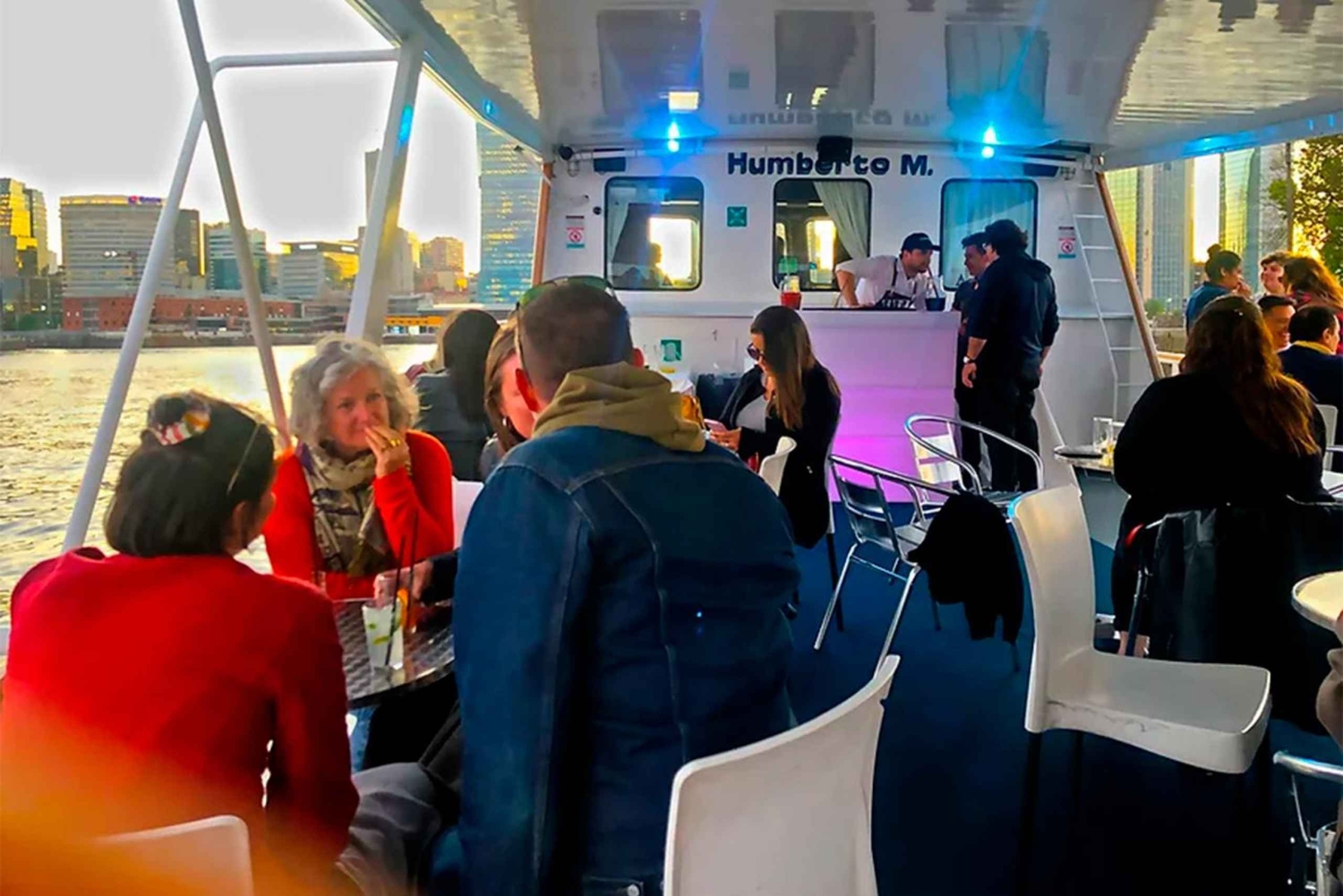 Embarca no Humberto M para uma noite inesquecível no Río de la Plata, mesmo no coração de Buenos Aires. Esta experiência de duas horas foi pensada para quem quer relaxar, celebrar ou simplesmente fazer uma pausa na agitação da cidade. Começa a tua noite com o barco ancorado no porto, onde podes explorar o espaçoso deck ou instalar-te no lounge com vidros e climatização. Enquanto a música define o ambiente, desfruta de bebidas nacionais, cerveja e refrigerantes ilimitados do open bar, criando a atmosfera perfeita para relaxar com amigos ou entes queridos. Após a primeira hora, chega o ponto alto da noite: o barco parte para um cruzeiro de uma hora ao longo do Río de la Plata. Sobe ao deck ao ar livre e vê como o horizonte da cidade brilha à luz dourada do pôr do sol. As vistas panorâmicas de Buenos Aires a partir da água oferecem uma nova perspetiva da cidade, com os últimos raios de sol a refletir no rio e a costa a ganhar vida com as luzes da noite. Quer estejas a celebrar uma ocasião especial, à procura de uma noite de encontro única ou simplesmente a querer desfrutar de boa companhia e ótima música, este cruzeiro oferece um ambiente descontraído, mas animado. A experiência termina no porto, deixando-te livre para continuares a tua noite em Buenos Aires ou passeares pela orla.Includes