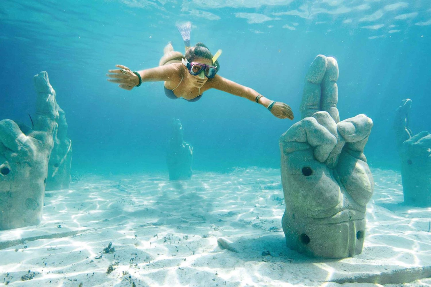 Aventura de catamarã de Cancún a Isla Mujeres Navega por águas azul-turquesa num passeio de catamarã inesquecível de Cancun à Isla Mujeres. Faz snorkel no Museu de Arte Subaquática de Cancun (MUSA) no recife 'El Meco' e explora a vibrante vida marinha entre esculturas submersas deslumbrantes. Desfruta de cerca de 90 minutos para explorar o encantador centro da cidade de Isla Mujeres antes de te dirigires a um clube de praia exclusivo para um delicioso buffet, um refrescante bar aberto e vistas relaxantes para o mar. Relaxa em cadeiras ou camas de rede, dá um mergulho na piscina e aproveita a atmosfera das Caraíbas. Este passeio com tudo incluído combina aventura, relaxamento e beleza natural para um dia perfeito no paraíso.Includes
