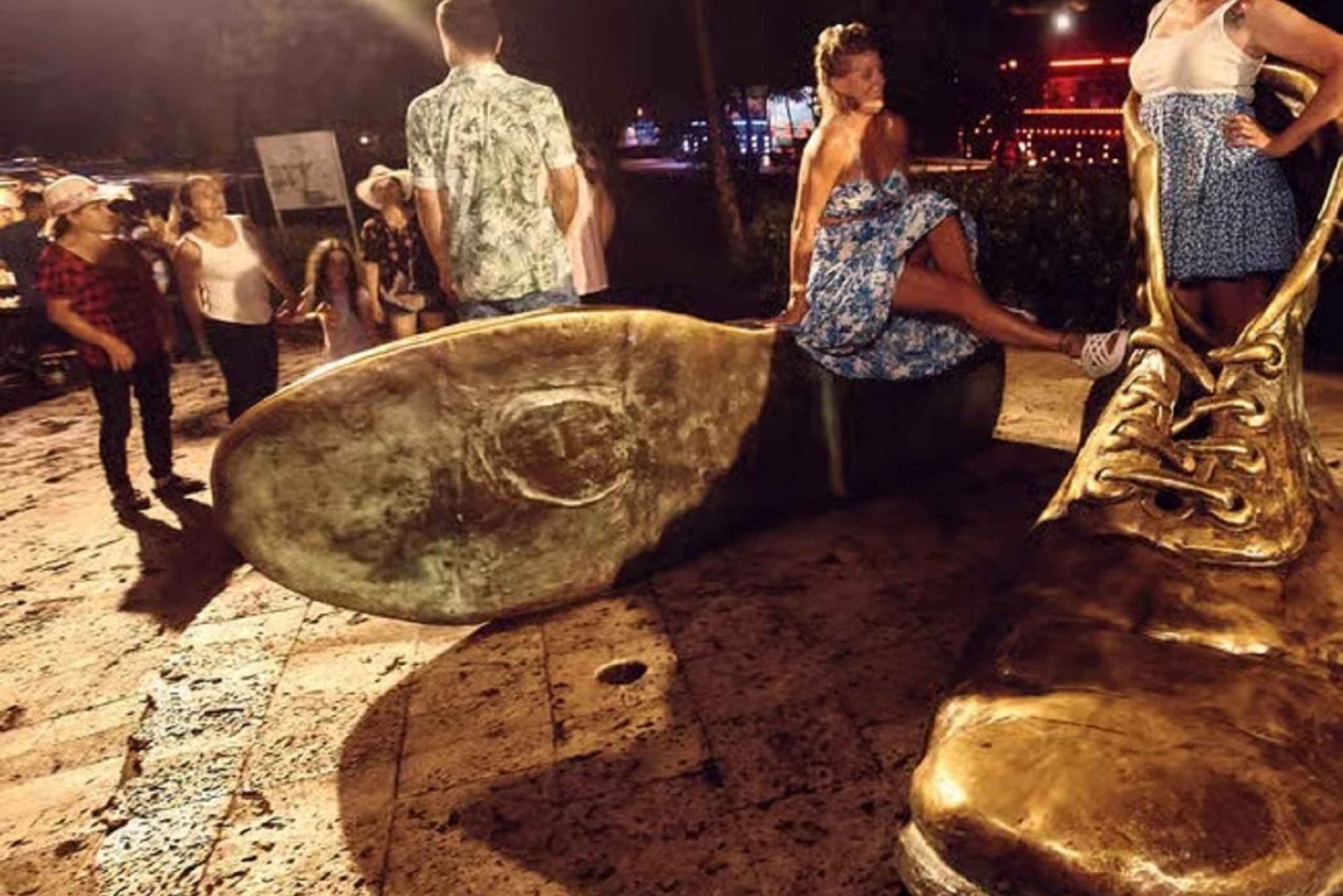 På vår tur kan du njuta av tid med din familj, vänner eller till och med som par, där du lär dig om historien bakom stadens mest ikoniska monument. Upphämtningstider vid mötesplatserna är kl. 19.20 vid Pegasus Pier i den muromgärdade staden och kl. 20.00 i Bocagrande och Laguito. Vid varje stopp har vi en paus på 10–15 minuter för att ta foton, gå på toaletten eller köpa souvenirer. Inträde till nattklubben är valfritt. De som vill gå in måste betala för sin egen resa tillbaka till hotellet. Det finns ingen åldersgräns för denna tur. Inträde till San Felipe-slottet ingår inte. TUR 21:00. En och en halv timmes nöje med rundtur i hotellområdet Bocagrande, panoramautsikt över gamla stan, klocktornet, Pegazos Pier, kongresscentret, Arsenal Street, stopp vid Los Zapatos Viejos, San Felipe-slottet och Cartagenas bokstäver för foton. Vi fortsätter turen längs murarna och avslutar vid nattklubben. Vi hämtar inte längre upp vid hotellen, utan har specifika mötesplatser.Includes